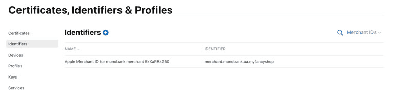 Для отримання доступу до Apple Pay API та авторизації платежів потрібно створити та налаштувати ідентифікатор мерчанта у панелі розробника Apple Developer. Таким чином у Вас буде Apple Merchant ID для передачі до Apple Pay API.