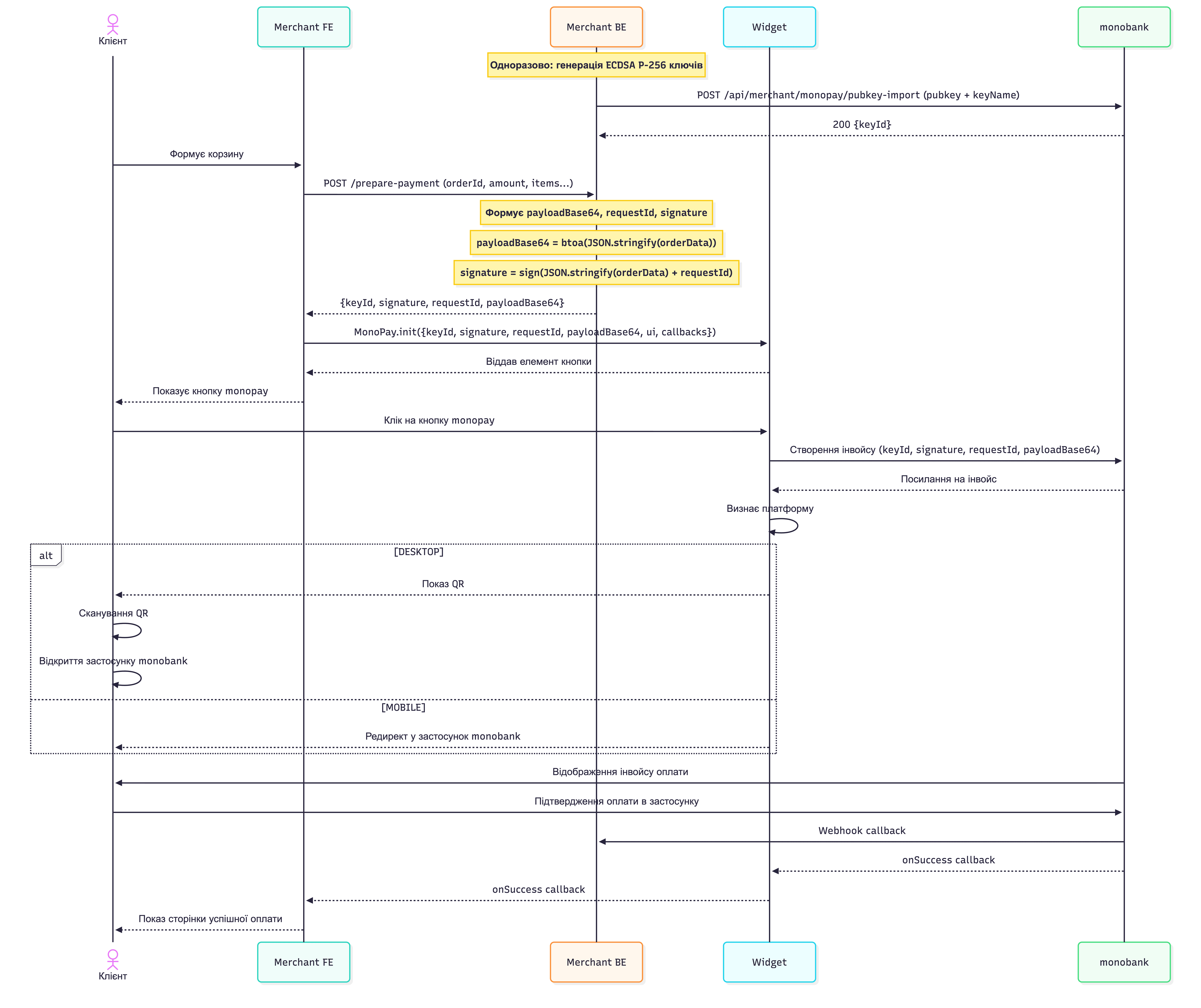 Платіжна кнопка monobank, яку мерчанти можуть вбудувати у свій веб-сайт. Після інтеграції покупці отримують додатковий спосіб оплати через monobank. Покупець обирає monopay, підтверджує платіж у monobank — ви одразу отримуєте статус оплати.