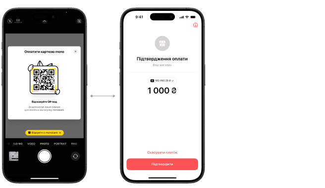 Віджет показує QR-код на екрані. Покупець сканує його камерою смартфона. Якщо застосунок monobank встановлено — відкриється екран підтвердження платежу.