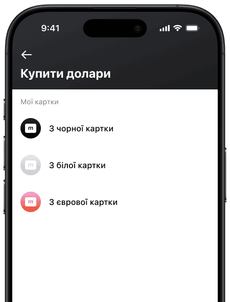 - Натискаєте на головному екрані картки “Купити долари”